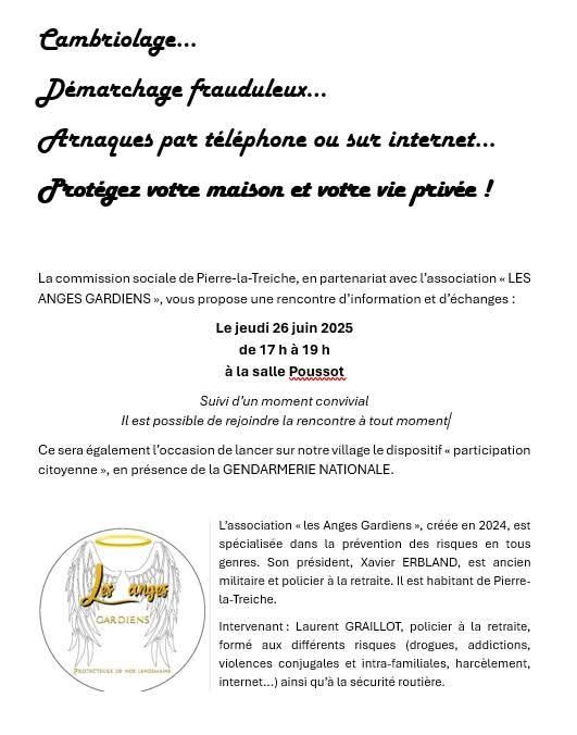 La commission sociale vous propose une 1ère rencontre sur la prévention, avec l'association "Les anges gardiens". Thème : protéger sa maison et sa vie privée.