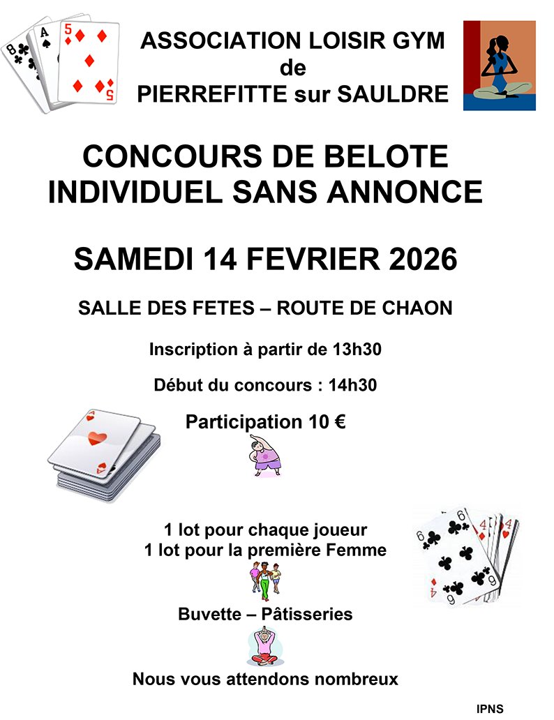 L’Association Loisirs Gym de Pierrefitte-sur-Sauldre organise un concours de belote individuel sans annonce le samedi 14 février 2026 à la Salle des fêtes, route de Chaon.