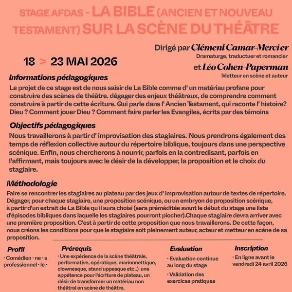 L’Aria propose un stage AFDAS « La Bible sur scène », dirigé par Léo Cohen-Paperman et Clément Camar-Mercier. Une exploration théâtrale de l’Ancien et du Nouveau Testament pour créer des scènes, interroger les récits et jouer avec leurs images.