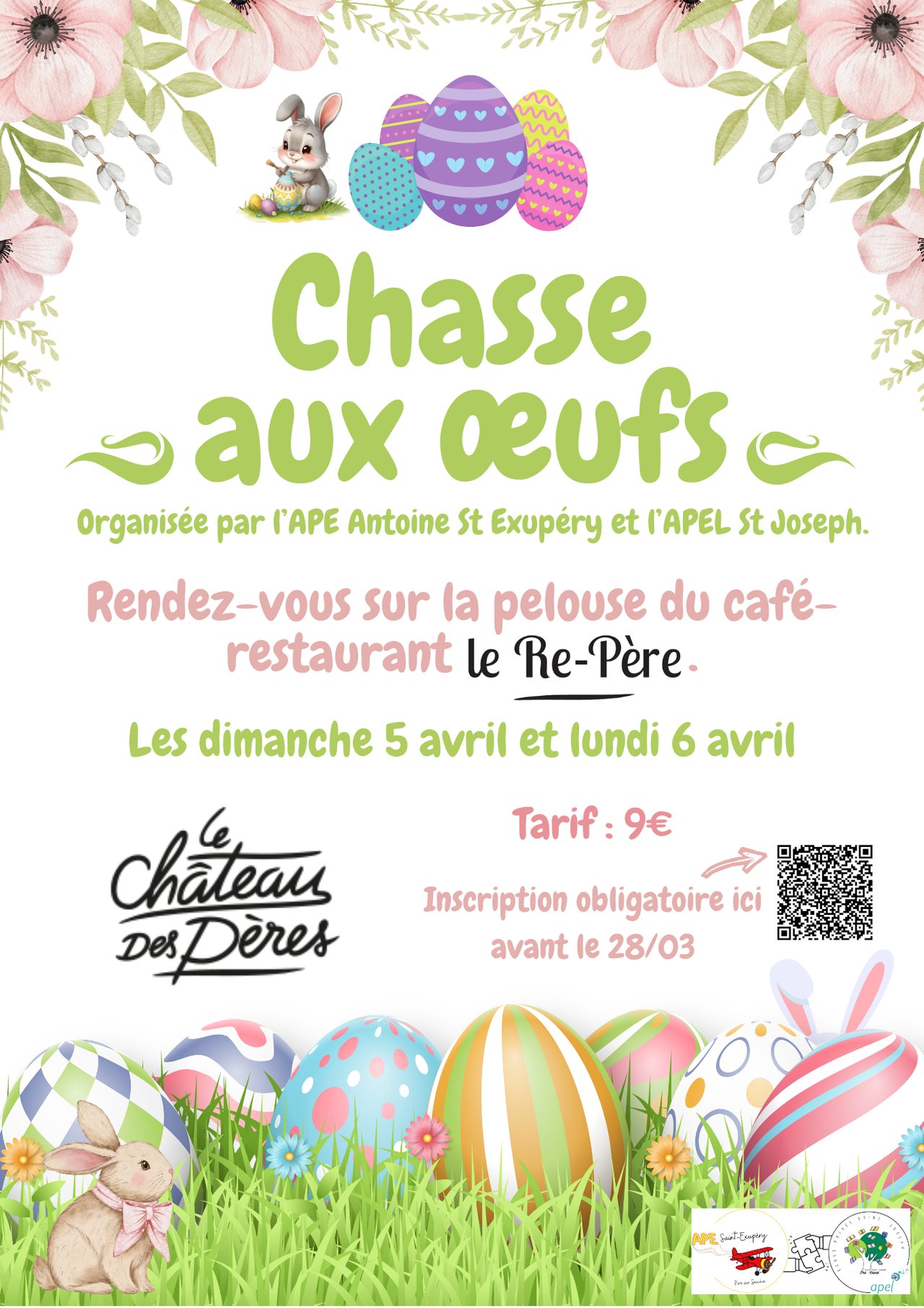 L’APE Antoine St Exupéry et l’APEL St Joseph vous invitent à venir célébrer l'arrivée du printemps lors d'une chasse aux œufs organisée sur la pelouse du café-restaurant le Re-Père.