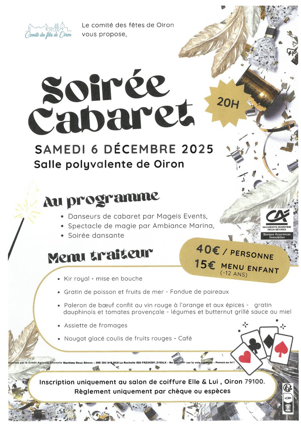Le comité des fêtes de Oiron organise une soirée cabaret le samedi 6 décembre 2025 à 20 H à la salle polyvalente de Oiron