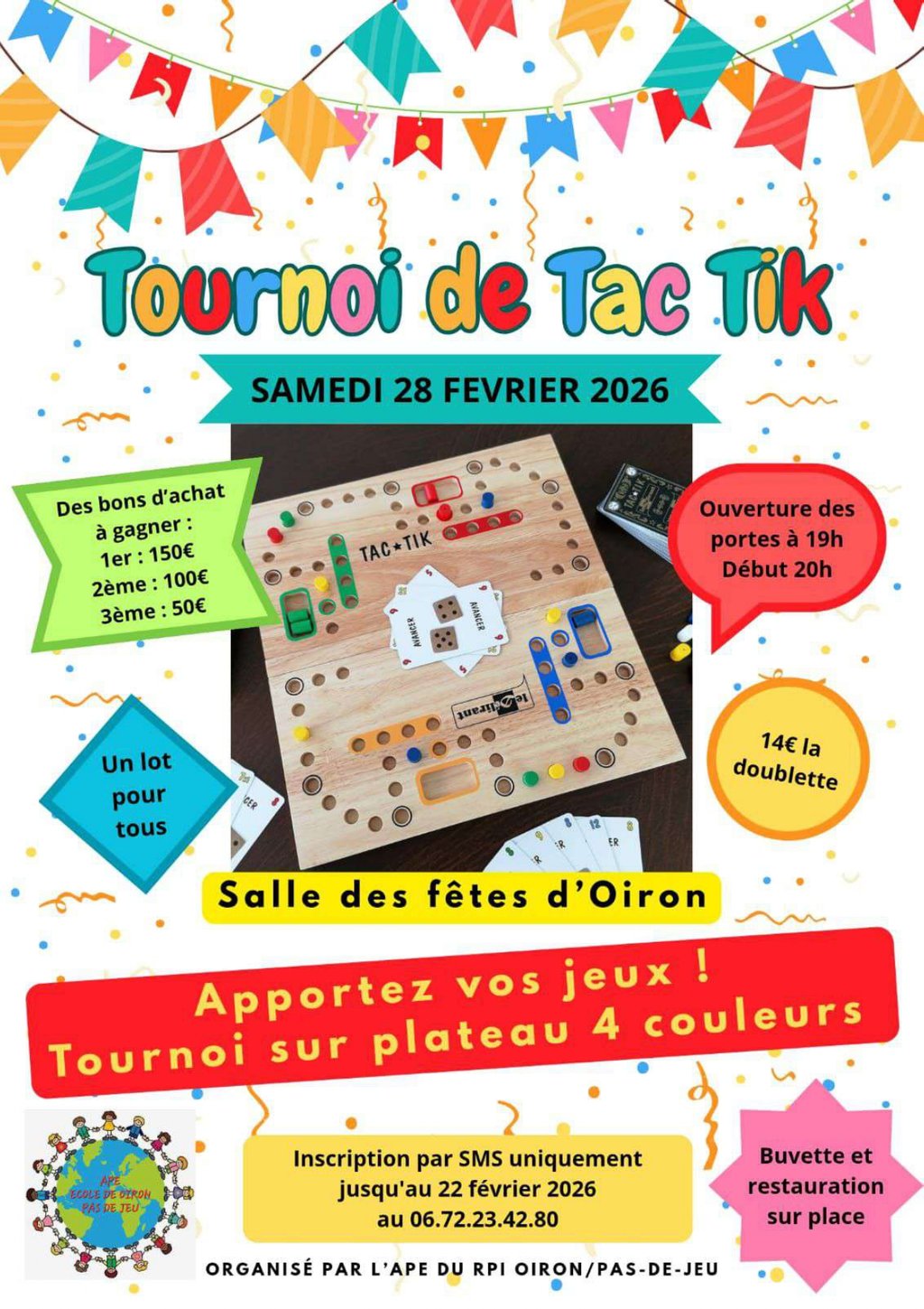 L' APE du RPI Oiron Brie Pas de Jeu organise un tournoi de Tac Tik le samedi 28 février 2026 à la salle des fêtes de Oiron
