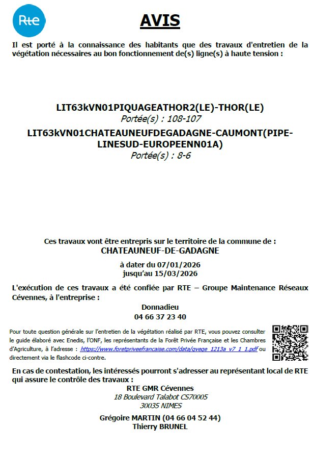 Ces travaux vont être entrepris sur le territoire de la commune de CHATEAUNEUF-DE-GADAGNE à dater du 07/01/2026 jusqu’au 15/03/2026