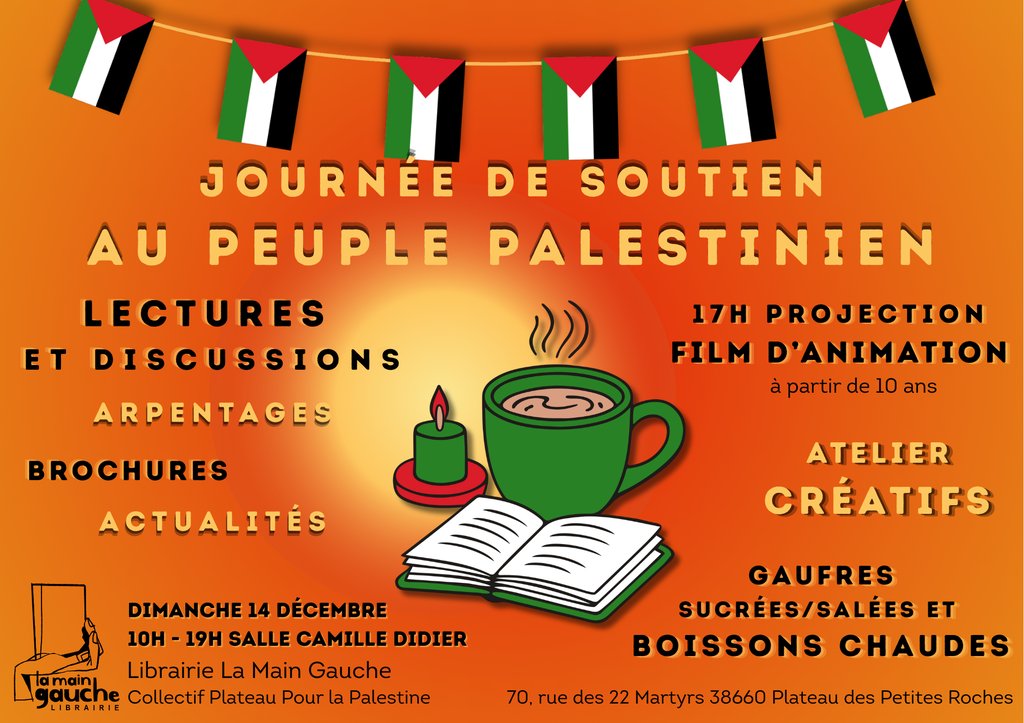 Le collectif Plateau Pour la Palestine vous invite, dimanche 14 décembre, à une journée de soutien au peuple Palestinien. Cette journée se déroulera à la salle Camille Didier de St Bernard entre 10h00 et 19h00.
