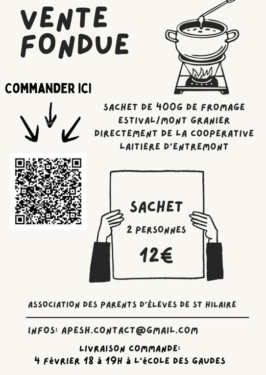 L’Association des Parents d’Élèves organise une vente de fondue afin de financer les projets de l’école.