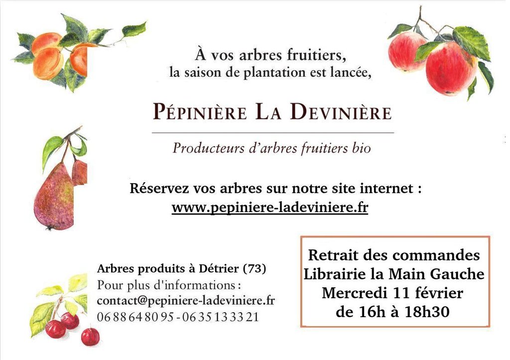 La pépinière la Devinière, producteurs d'arbres fruitiers et de petits fruits de variétés anciennes & locales à Détrier, sera présente à la librairie la Main Gauche à Saint Benard le mercredi 11 février de 16h à 18h30 !