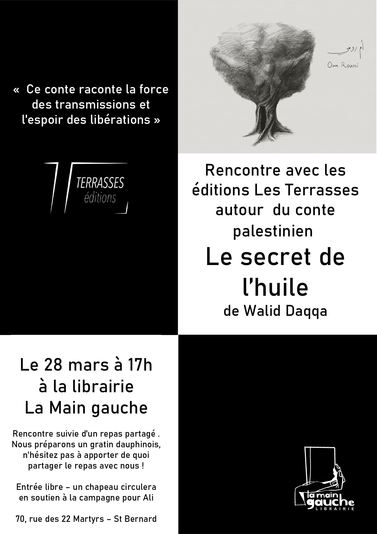Rencontre-discussion avec deux éditeur.ices de la maison d'édition Les Terasses autour du conte palestinien Le secret de l'huile de l'ex-prisonnier et écrivain palestinien Walid Daqqa.