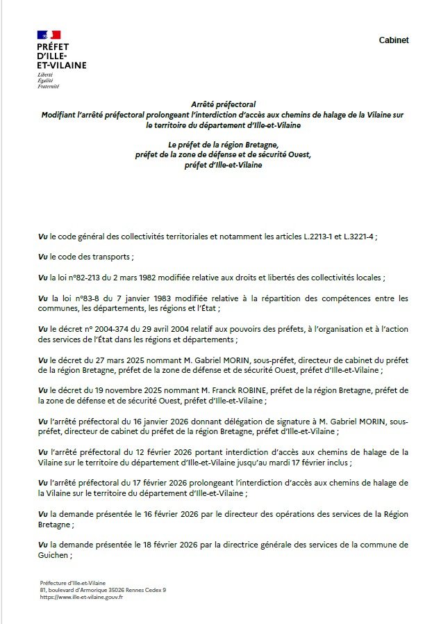 Dans le cadre de la situation météorologique liée aux inondations / crues dans le département d'Ille-et-Vilaine, un arrêté préfectoral en date de ce jour prolongeant l'interdiction d'accès aux chemins de halage de la Vilaine.