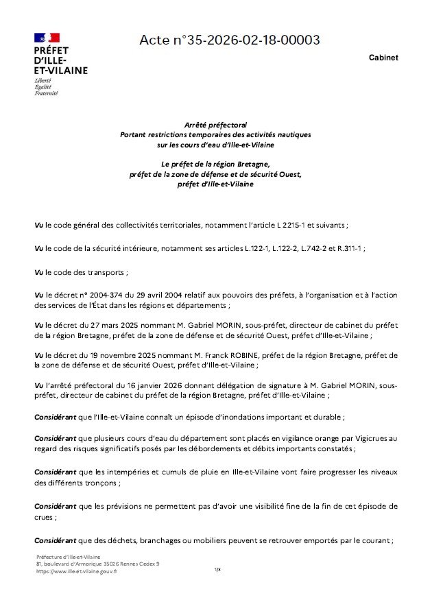 Vous trouverez en pièce-jointe un arrêté portant interdiction des activités nautiques sur les cours d'eau en Ille-et-Vilaine. Cette interdiction demeure jusqu'à la fin de la période de vigilance orange crues dans le département.