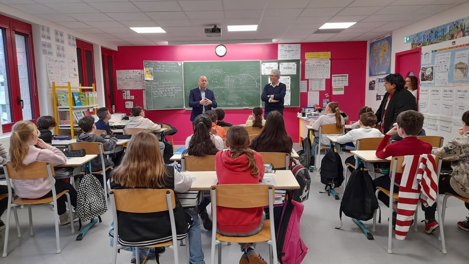 Les élèves de CM2 de l'école publique Gisèle Halimi, avec leur enseignant Dominique Piot, participent cette année au Parlement des enfants. Dans ce cadre, de façon a bien appréhender ce qu'est le Parlement et son fonctionnement, en présence de Sylvie Pigeon, adjointe en charge du périscolaire, le député Thierry Benoît a échangé avec les élèves ce matin. Le député s'est prêté au jeu des questions posées par les élèves.