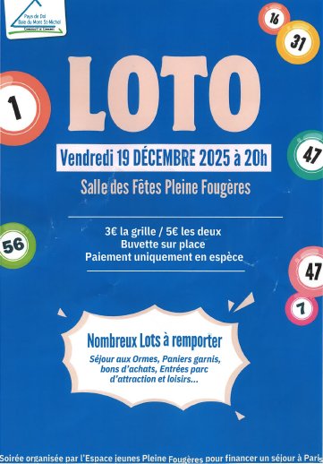 Vendredi 19 décembre, 20 heures à la salle des fêtes de Pleine-Fougères l'Espace Jeunes organise un loto afin de pouvoir financer un séjour à Paris.