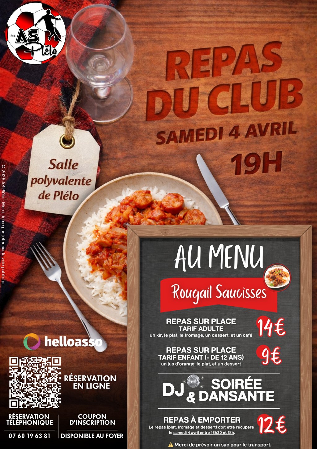 Le club de football de l’AS Plélo organise son repas annuel le samedi 4 avril à partir de 19h, à la salle polyvalente de Plélo.Un rendez-vous convivial ouvert à l’ensemble des licenciés, bénévoles, familles et sympathisants du club.