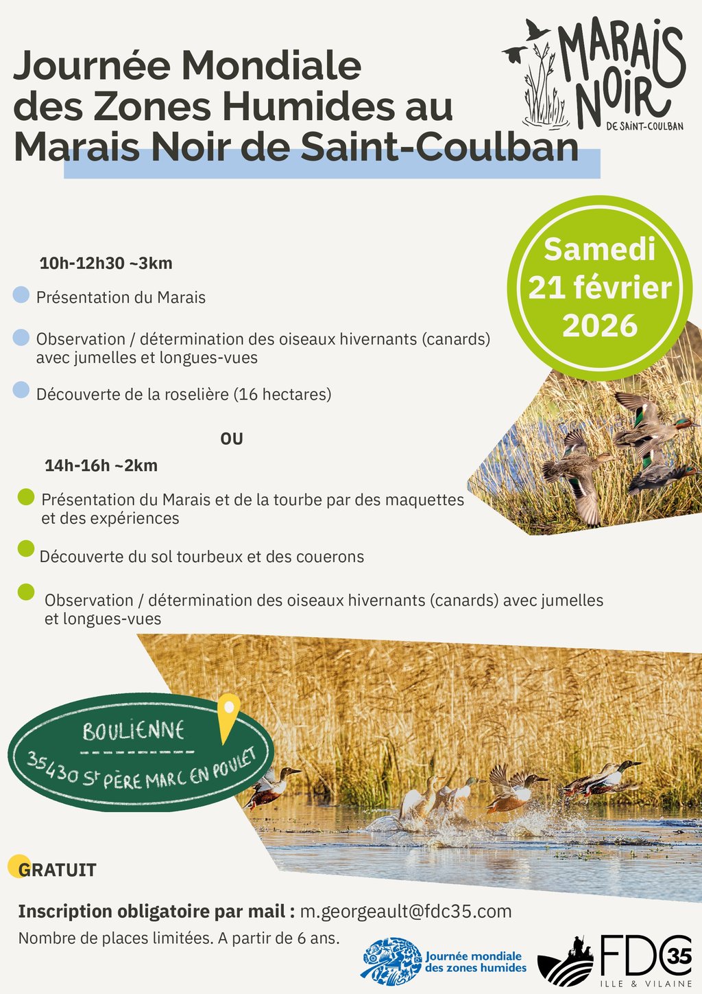 À cette occasion, la Fédération vous propose une animation gratuite au Marais Noir de Saint-Coulban le samedi 21 février 2026.