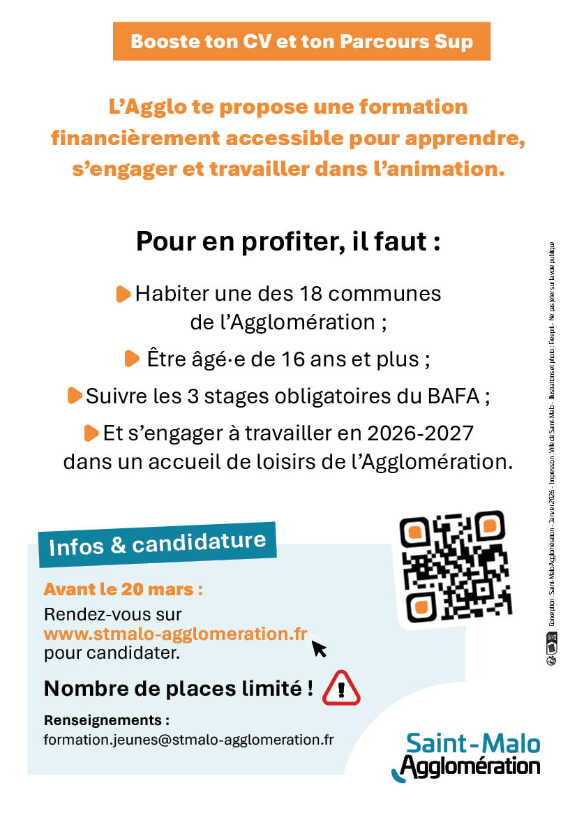 Les candidatures sont ouvertes du lundi 16 février au vendredi 20 mars via un formulaire en ligne : https://www.stmalo-agglomeration.fr/.../demarches.../bafa/