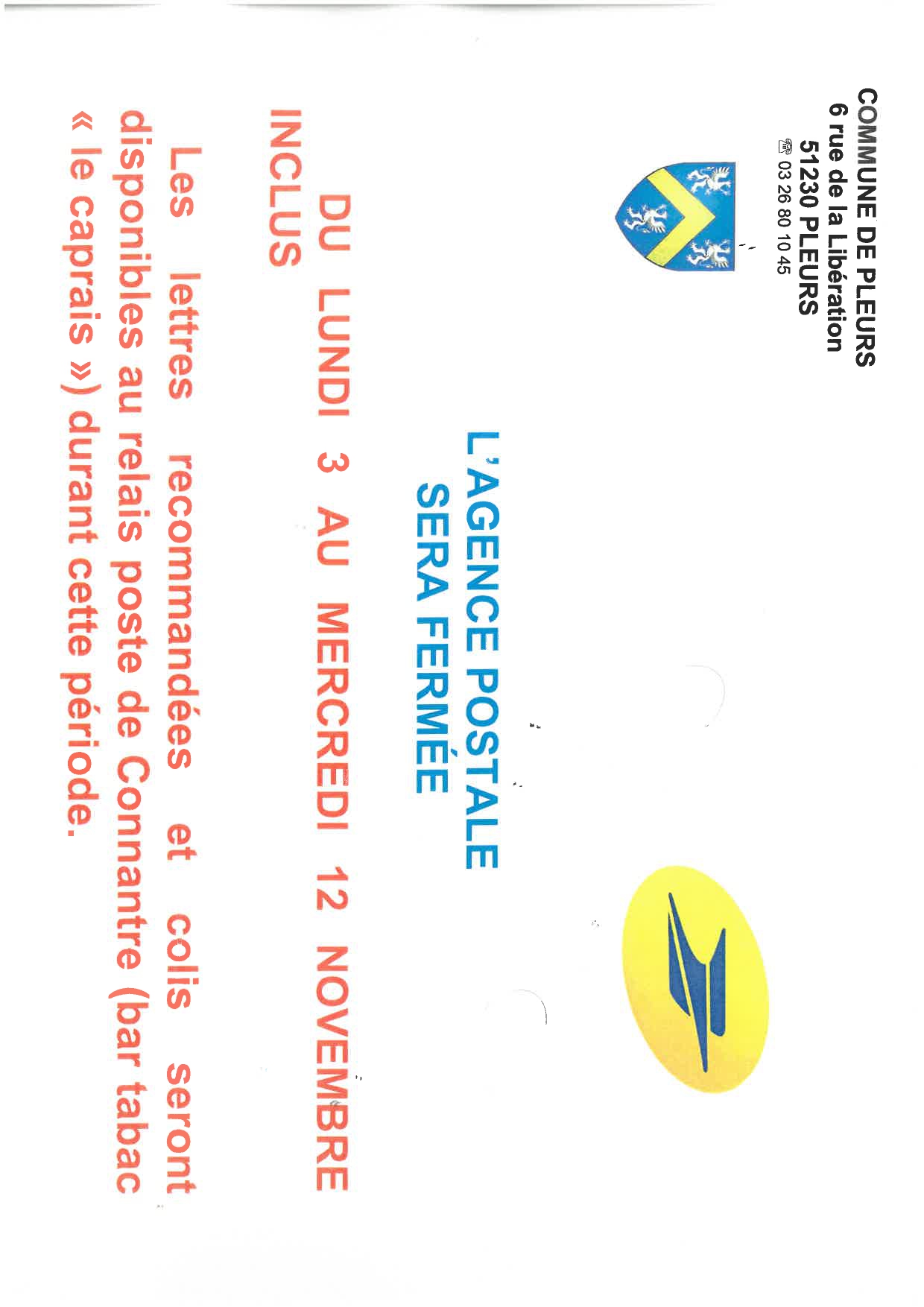 Votre agence postale communale sera fermée du lundi 3 au mercredi 12 novembre inclus
