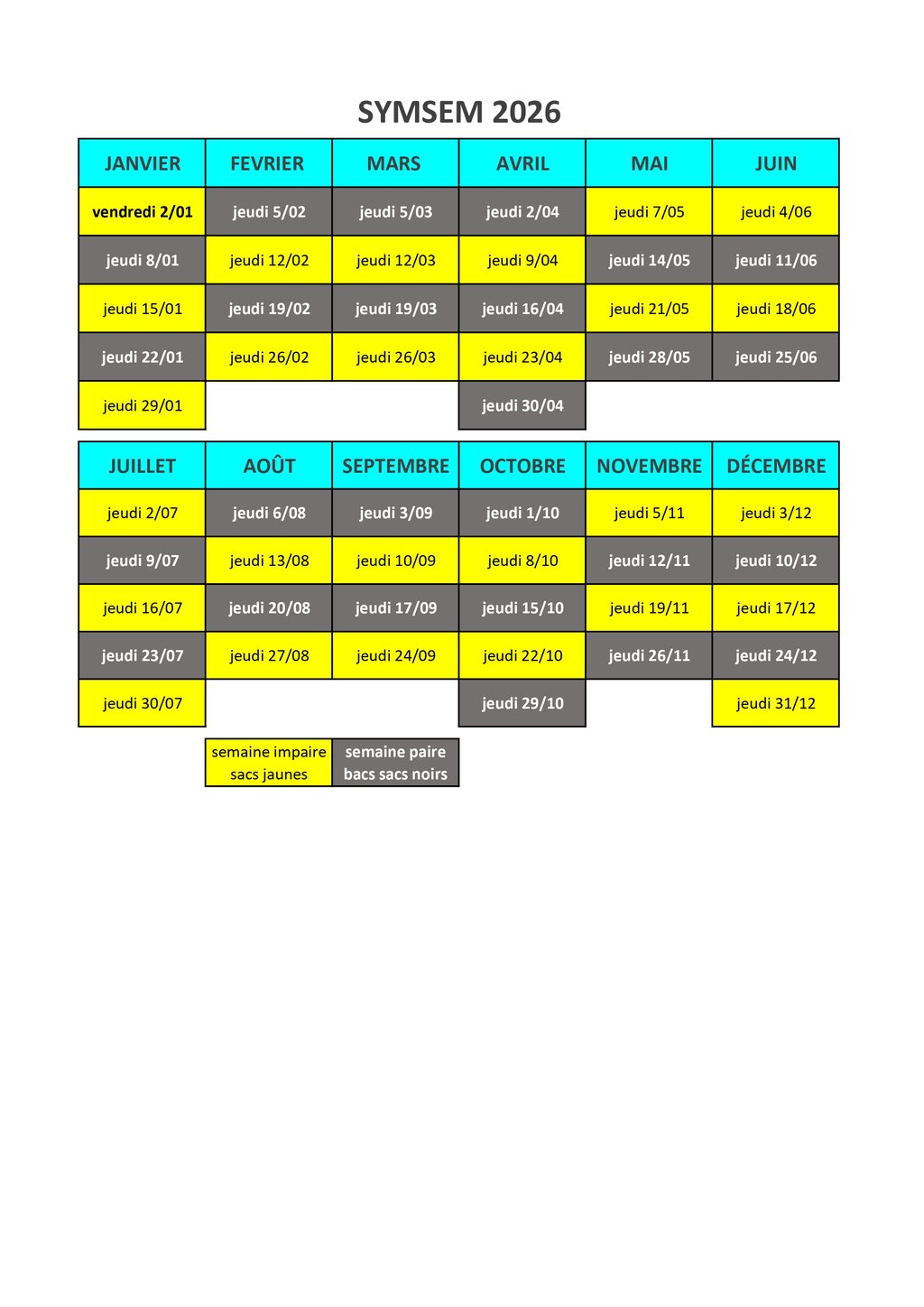 CALENDRIER 2026 DES COLLECTES DU SYMSEM