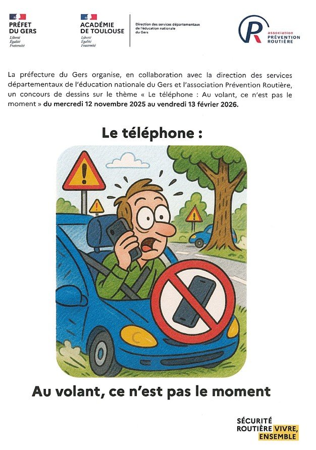 La préfecture du Gers en partenariat avec l’Éducation nationale et l'association Prévention Routière organise du 12 novembre 2025 au 13 février 2026 un concours de dessins : Le téléphone : Au volant, ce n'est pas le moment.