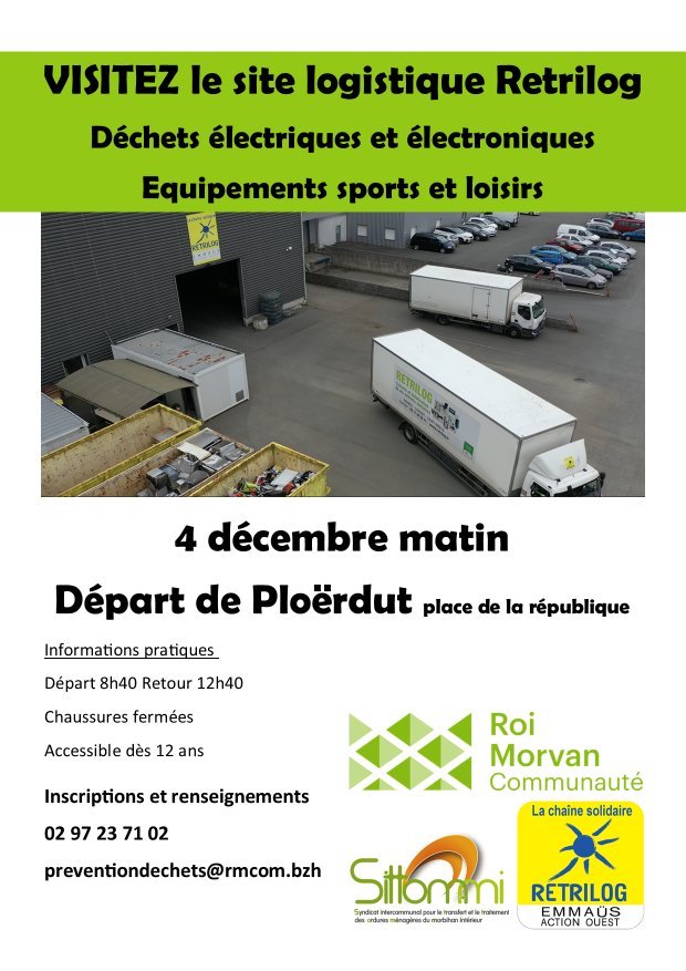 Visite du centre Retrilog. Venez découvrir où vont ces déchets une fois déposer en déchèterie. Animation organisée dans le cadre de la semaine de réduction des déchets. Un car est prévu au départ de Ploërdut.