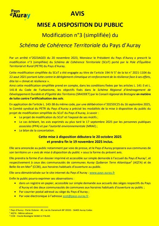 >> Le Pays d’Auray organise une réunion publique pour annoncer cette mise à disposition du public, le 16 octobre 2025 à 18h30, salle Kozh Kastell à Pluvigner (Bieuzy-Lanvaux).