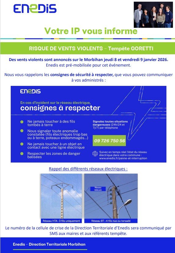 Enedis souhaite communiquer sur le risque de vents violents annoncé sur le Morbihan jeudi 8 et vendredi 9 janvier 2026.