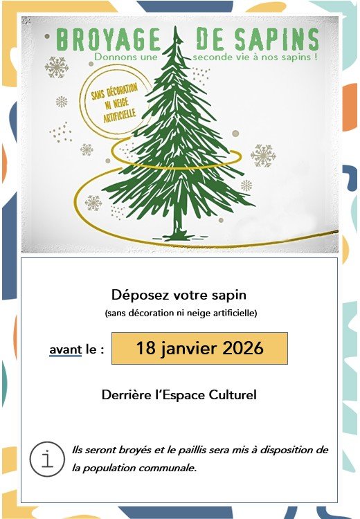 Vous pouvez venir le déposer jusqu'au 18 janvier 2026, sur le parking derrière la salle socio-culturelle, dans l’espace dédié, pour que celui-ci soit broyé.