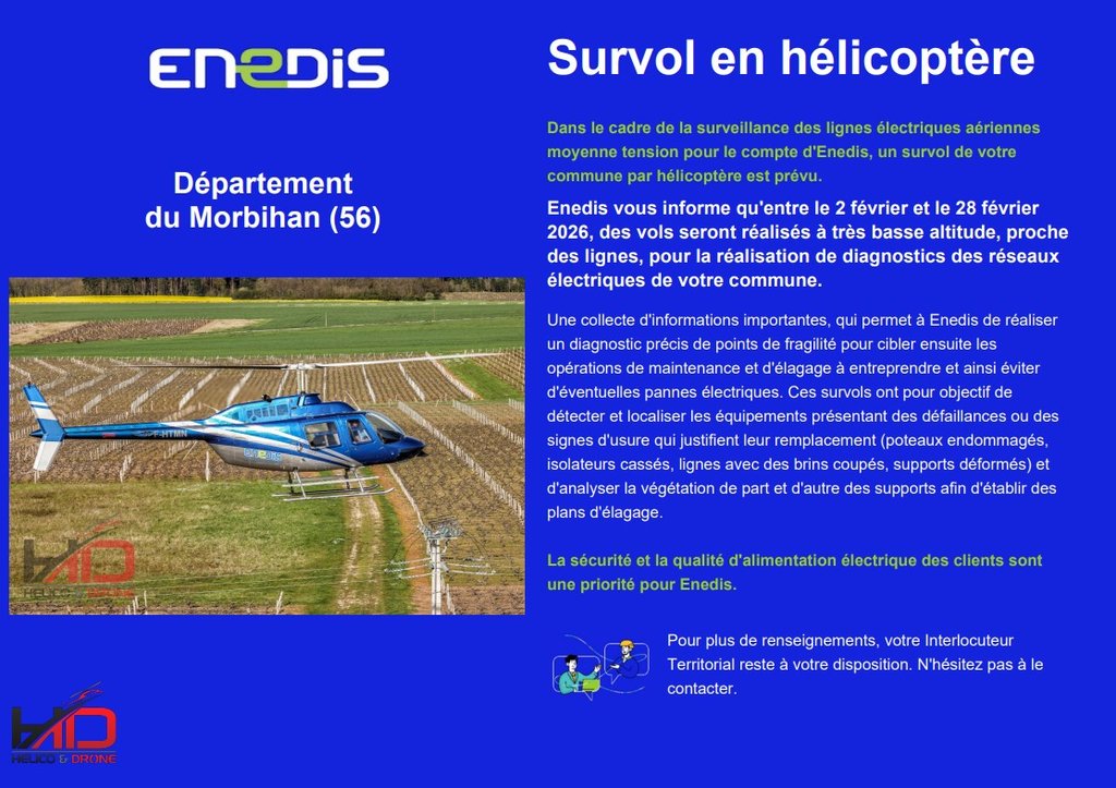 Dans le cadre de la surveillance des lignes électriques, ENEDIS vous informe qu'un hélicoptère survolera certaines communes du département du Morbihan à très basse hauteur.