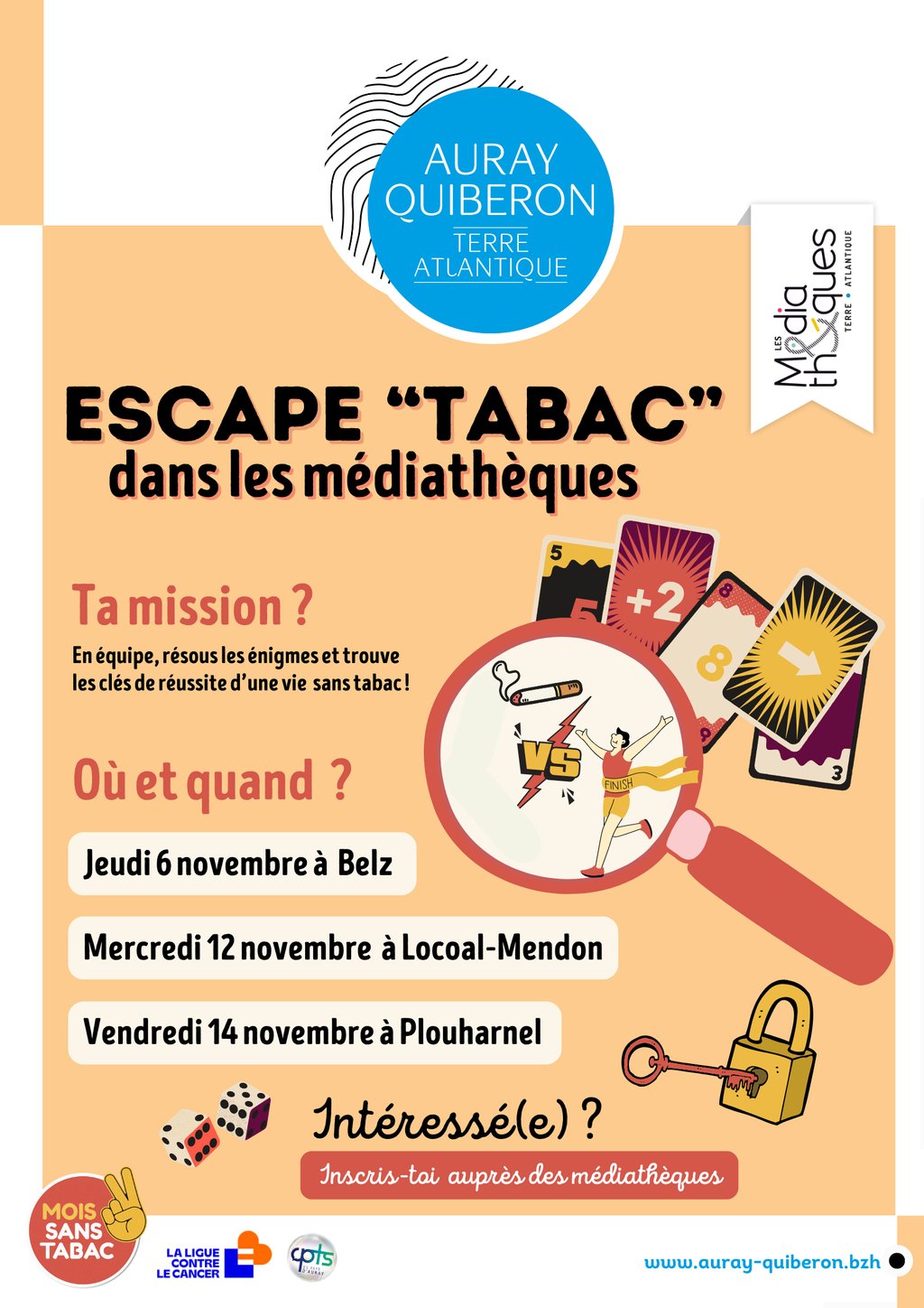 Dans le cadre du mois sans tabac, AQTA organise un escape game pédagogique « Escape Tabac» conçu par la Ligue contre le cancer, proposé dans plusieurs médiathèques du territoire.