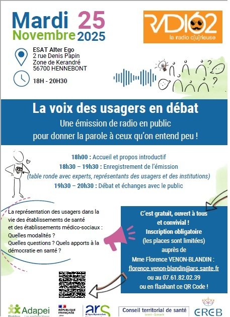 L'Agence Régionale de Santé vous informe de l'enregistrement d'une émission de radio autour de "La démocratie en santé" le mardi 25 novembre de 18h à 20h30 au foyer Alter Ego de l'ADAPEI à Hennebont.