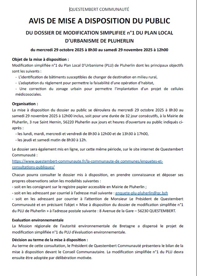 Information PLU : Mise à disposition du public du dossier de modification simplifiée du Plan Local d'Urbanisme de Pluherlin du mercredi 29 octobre à 8h30 au Samedi 29 novembre 2025 à 12h.