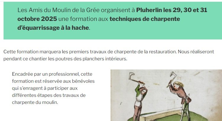 Les amis du Moulin de la Grée organise une formation aux techniques de charpente d’équarrissage à la hache., à Pluherlin les 29, 30 et 31 octobre 2025 pour les bénévoles qui souhaitent s'engager dans ce projet.