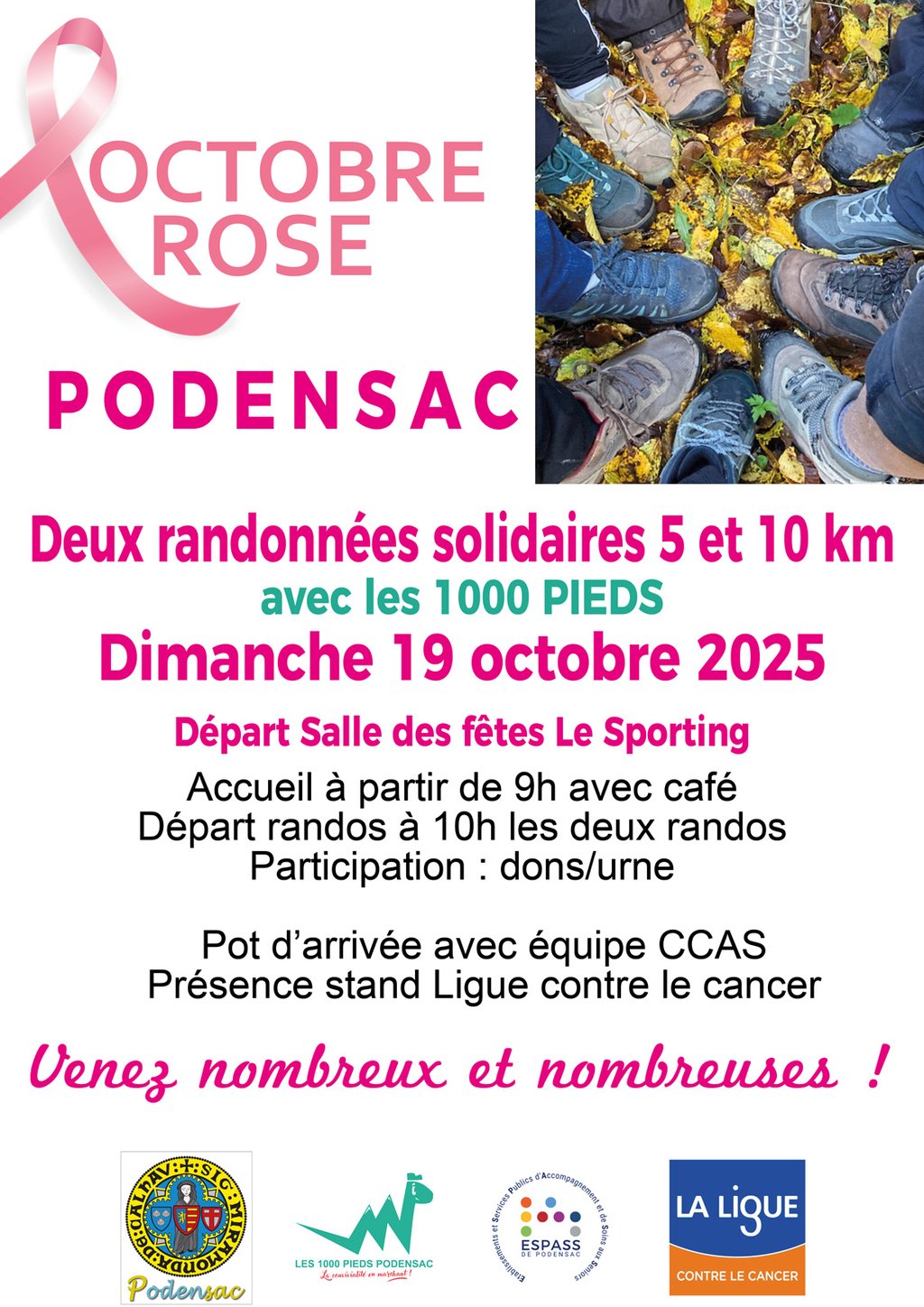 Dans le cadre de la campagne annuelle Octobre rose, destinée à sensibiliser au dépistage du cancer du sein et à récolter des fonds pour la recherche, le CCAS de Podensac contribue à plusieurs actions. Ainsi, chaque année, le CCAS s’associe à l'association de randonnées Les 1000 Pieds pour proposer une marche solidaire le dimanche 19 octobre.
