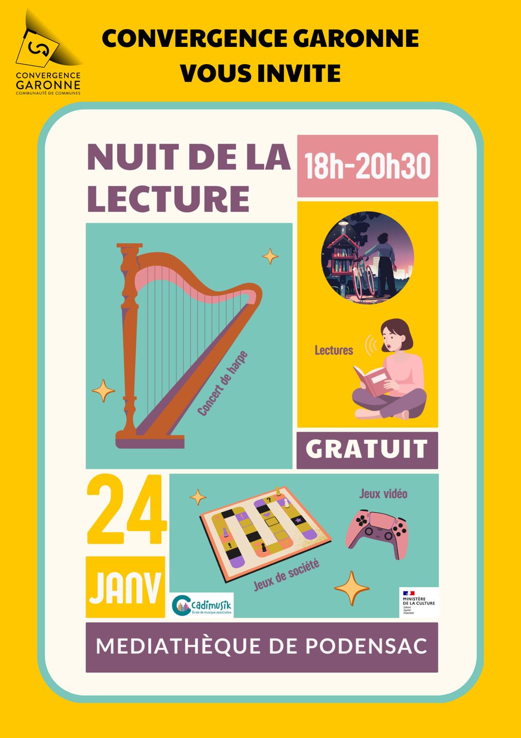 À l’occasion des Nuits de la lecture, la médiathèque intercommunale de Podensac vous ouvre ses portes pour une soirée conviviale mêlant lectures à haute voix, jeux vidéos et jeux de société pour tous les âges. Laissez-vous porter par les mots, le jeu et la découverte dans une ambiance chaleureuse et ludique. La soirée se conclura en douceur avec un concert de harpes proposé par l’école de musique Cadimusik.