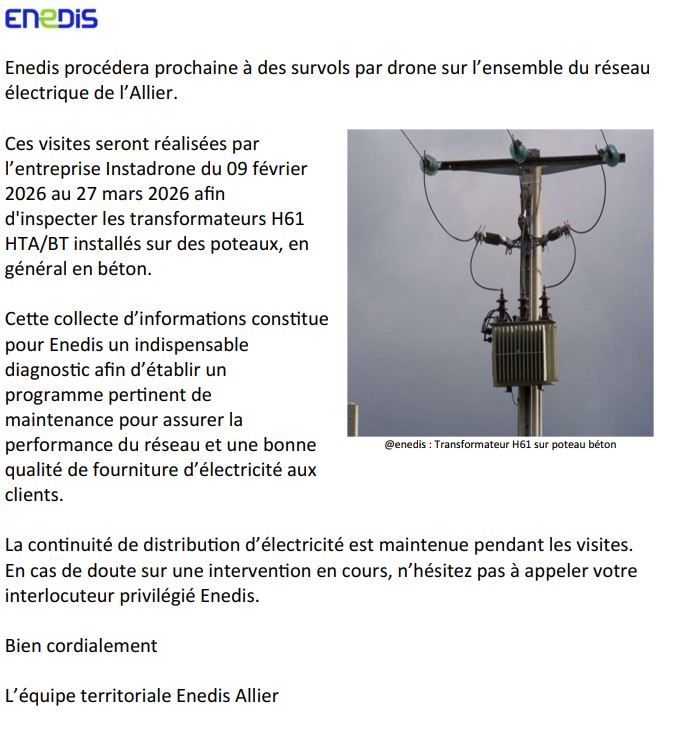 Enedis nous informe que l'entreprise Interdrone procèdera à des survols par drone du réseau électrique sur l'ensemble du territoire départemental entre le 9 février et le 27 mars 2026.
