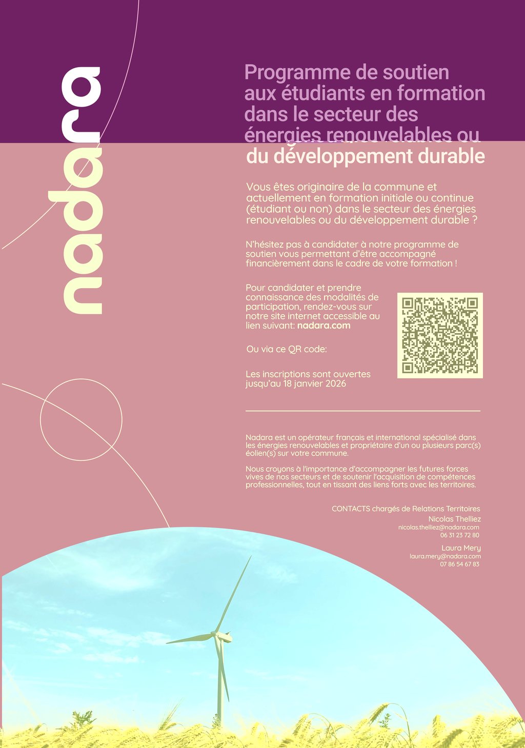 En tant que propriétaires d’un parc éolien situé sur la commune, Nadara a le plaisir de vous adresser son programme de soutien à la formation dans les énergies durables et/ou développement durable.