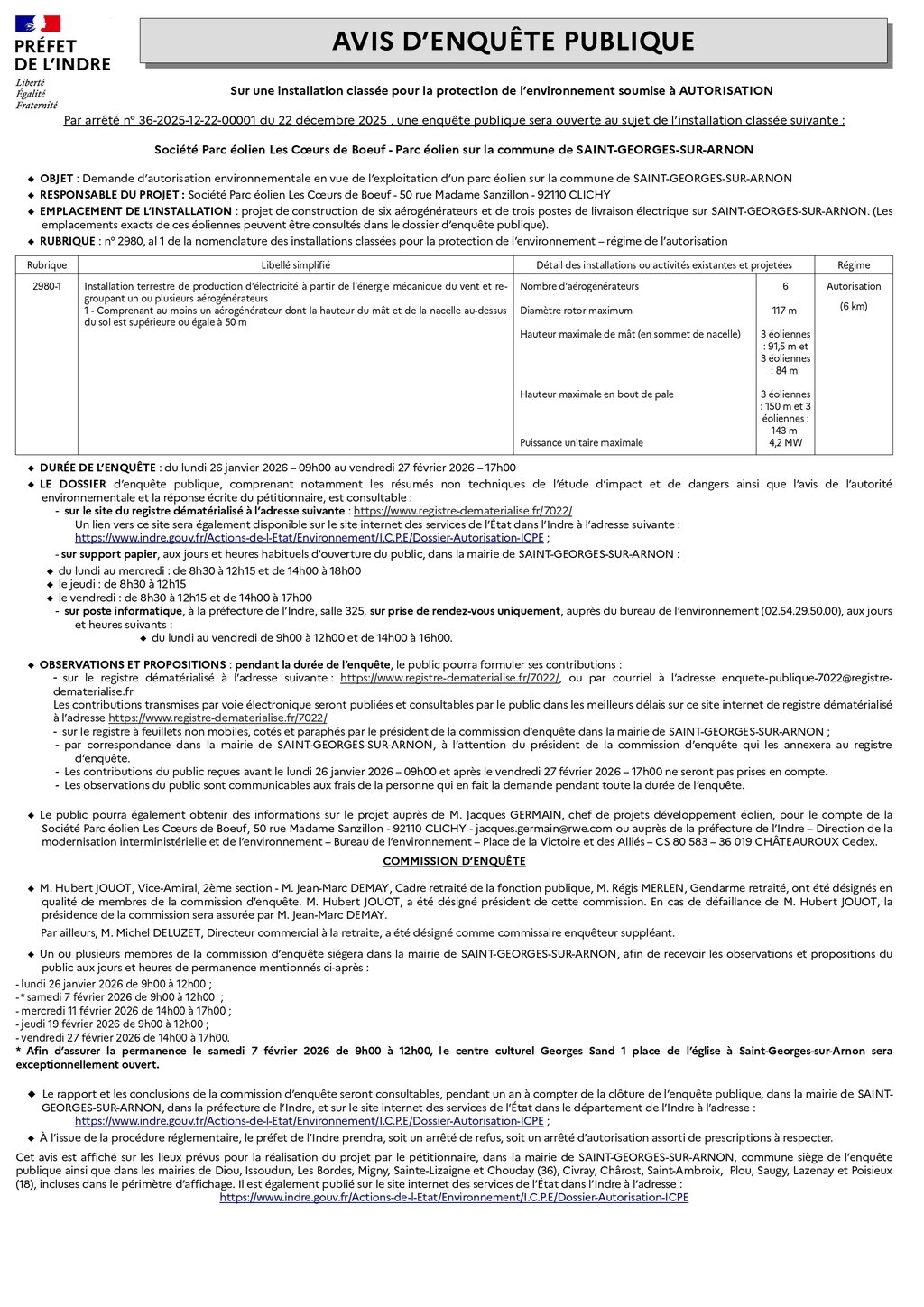 ENQUÊTE PUBLIQUE - PARC ÉOLIEN LES COEURS DE BOEUF - SAINT-GEORGES-SUR-ARNON
