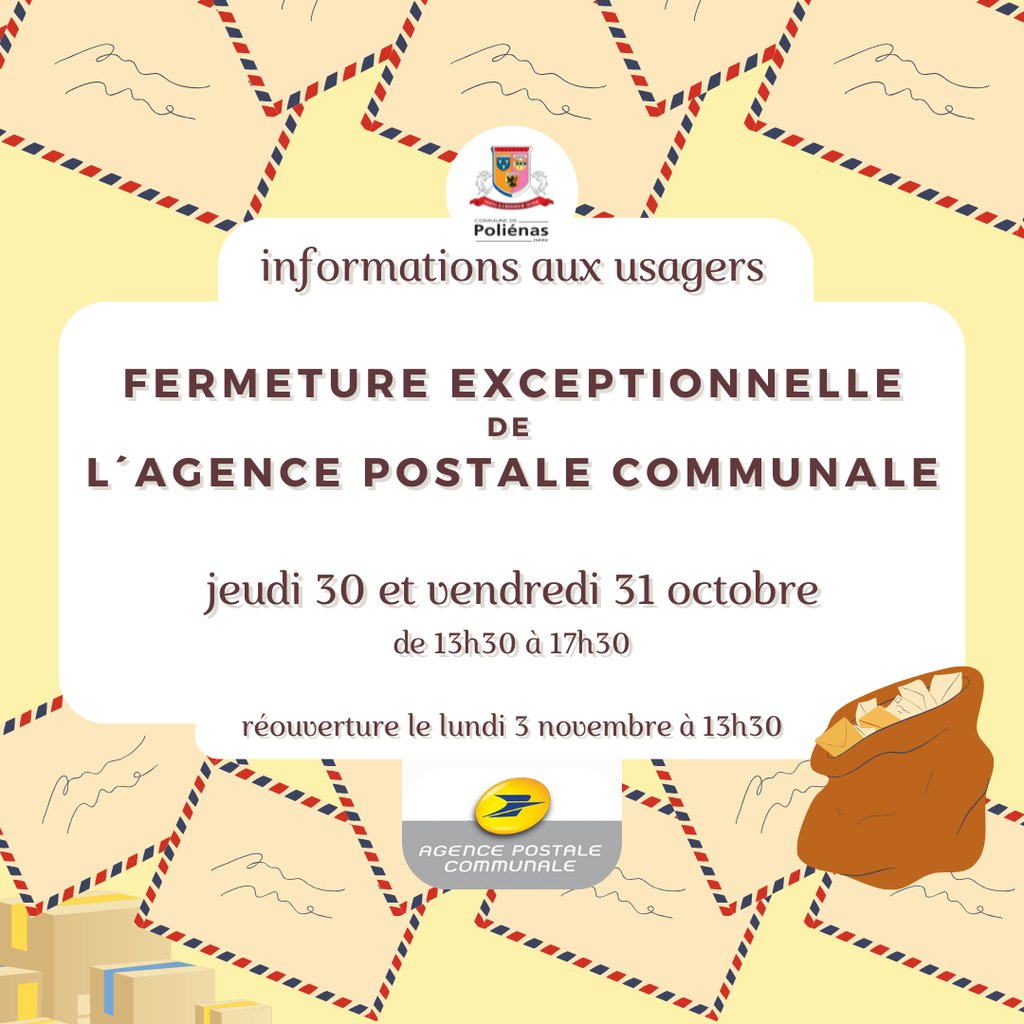 Votre agence postale sera exceptionnellement fermée les jeudi 30 et vendredi 31 octobre.