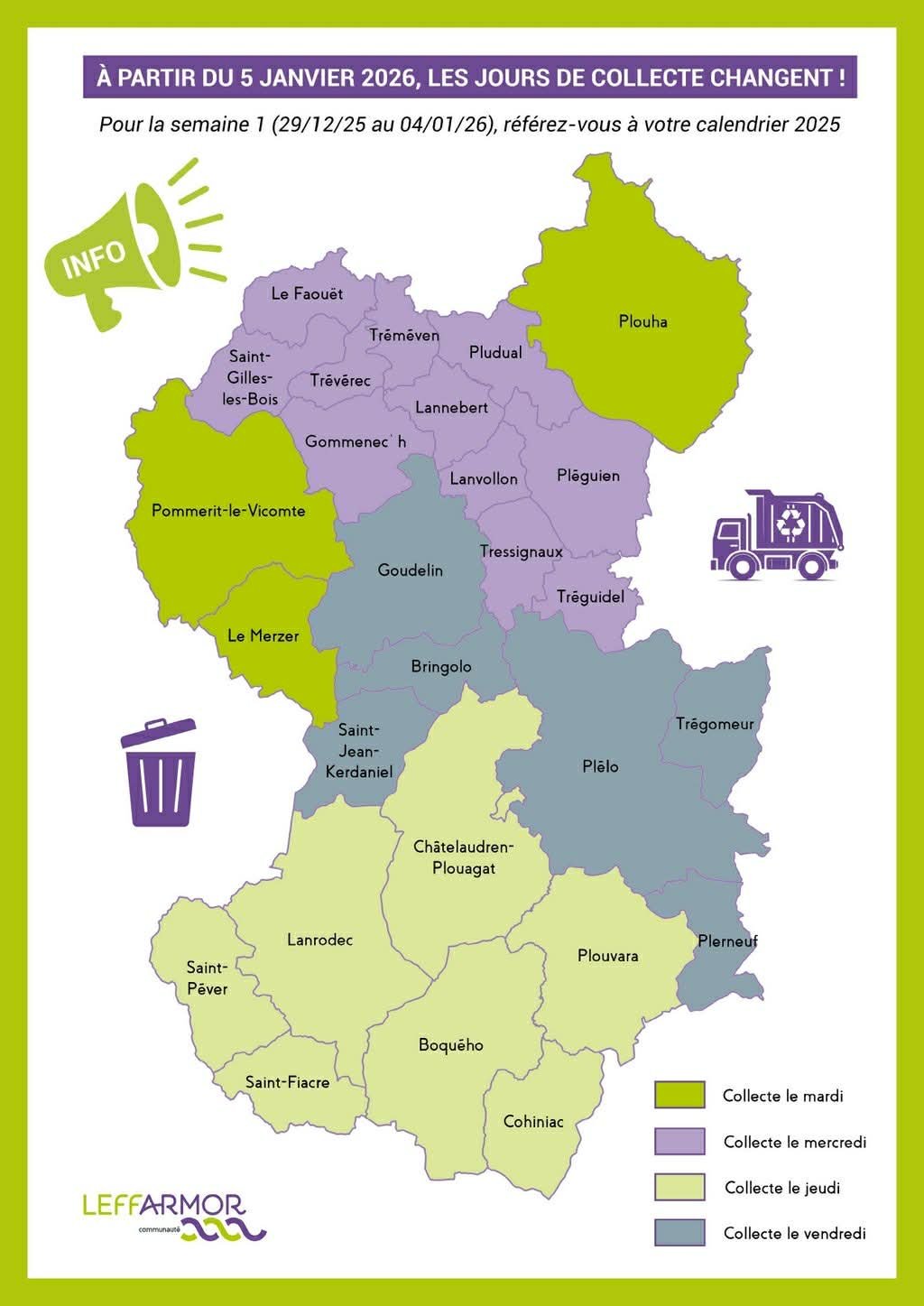 Nous vous invitons à consulter votre calendrier de collecte 2026 sur cette page : https://www.leffarmor.fr/le-service-de-collecte-en-porte-a-porte/