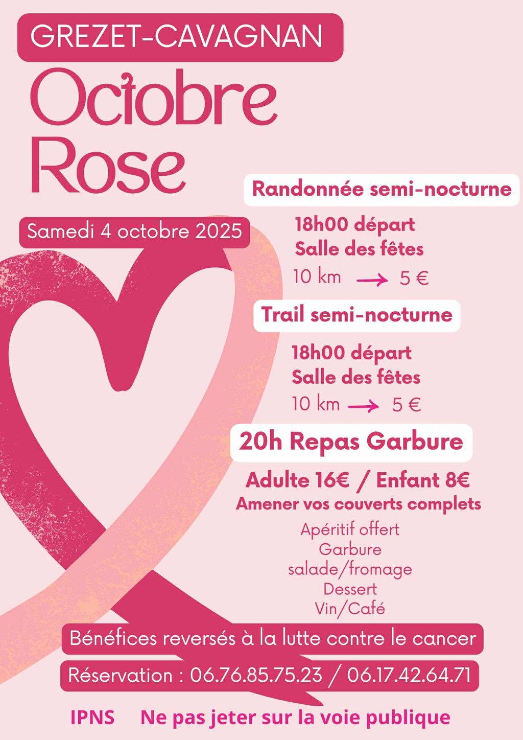 Pour la quatrième fois, la mairie de Grézet-Cavagnan, accompagnée par ses associations communales organise une randonnée / course nature suivie d'un repas garbure. Vous pouvez participer à l'un, à l'autre ou au deux !! Les fonds récoltés seront reversés à la lutte contre le cancer.