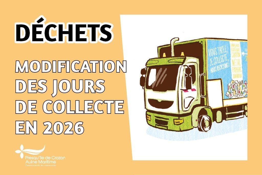 Pour rappel : un nouveau calendrier de collecte 2026 a été envoyé par courrier à chaque foyer. Si vous ne l'avez pas reçu, n'hésitez pas à contacter le service prévention et gestion des déchets (ti@comcom-crozon.bzh – 02 98 16 02 50 | 02 98 16 02 51).