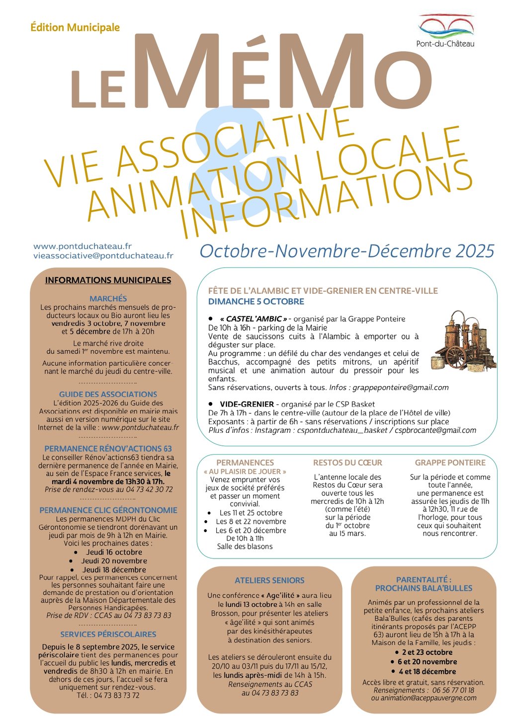 Les manifestations associatives et infos locales à ne pas manquer sont désormais disponibles : consultez le MéMo octobre-décembre 2025 en ligne ou retrouvez-le dans vos boîtes aux lettres.