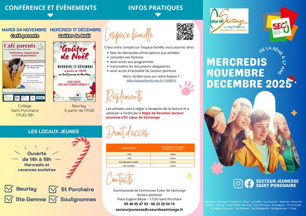Le Sec'J de notre Communauté de Communes Coeur de Saintonge vient de nous communiquer le programme des animations et des sorties de novembre et décembre 📅👨👨👩👧⛸🍿👩👩👦🎁
