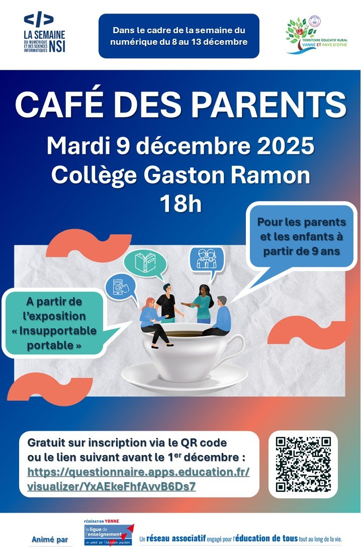 Dans le cadre de la Semaine du numérique, un café des parents est organisé le mardi 9 décembre 2025 à 18h au collège Gaston Ramon de Villeneuve-l’Archevêque.