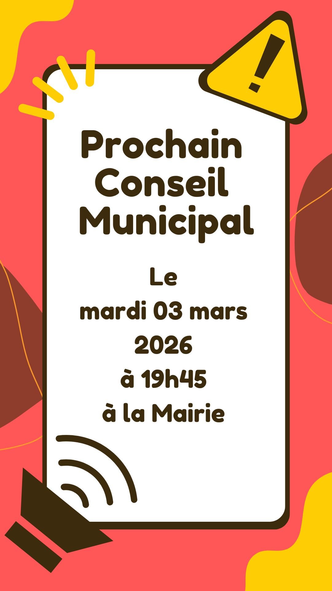 Le prochain Conseil Municipal aura lieu le mardi 03 mars 2026, à 19h45, à la Mairie.