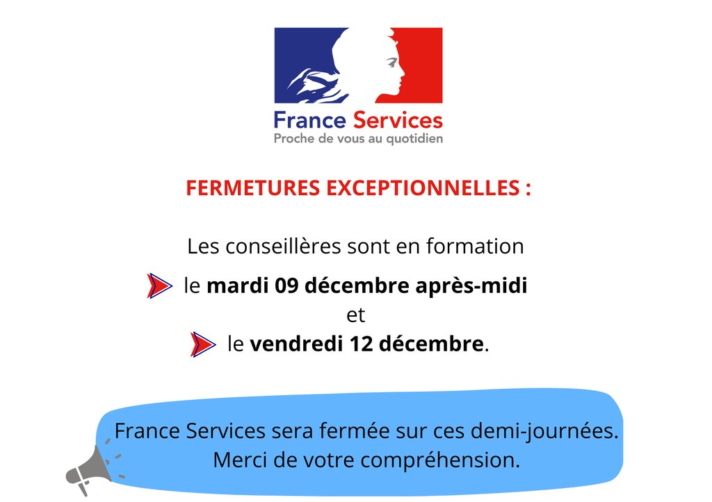 📣 France Services sera fermée sur ces demi-journées. Merci de votre compréhension.
