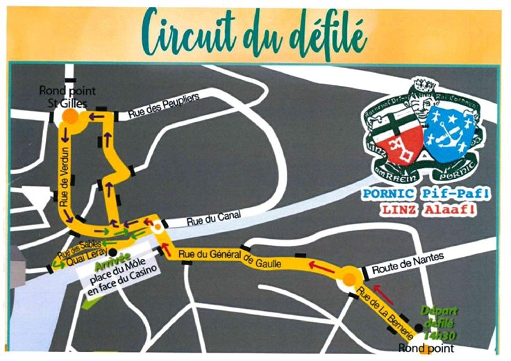 🚩 Le défilé se dirigera vers la gare, les rues Sainte-Anne, rond-point Saint-Gilles, puis rues de Verdun et Foch, et rues de la Marine et des Sables, avant de rejoindre la place du Môle vers 19h.