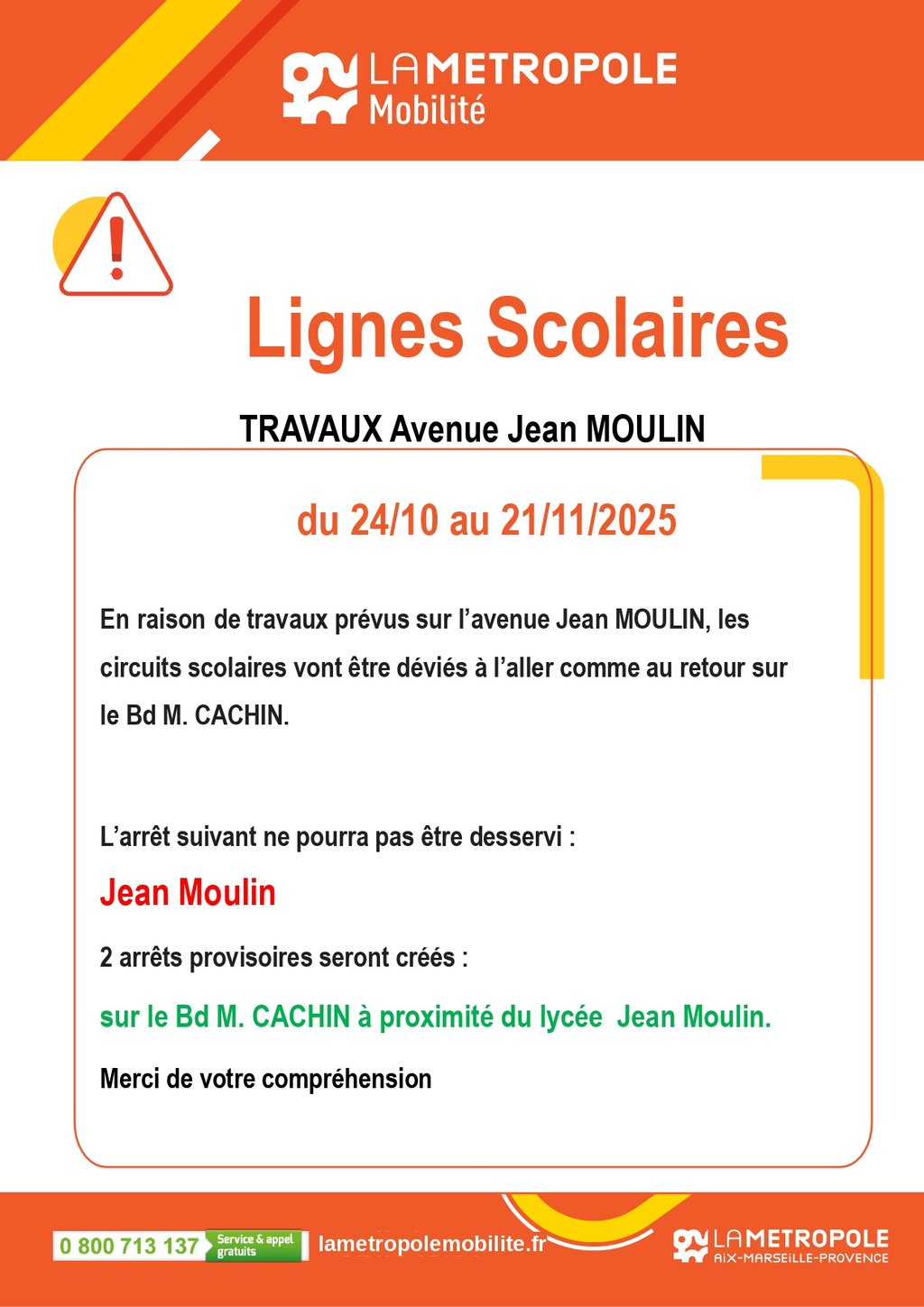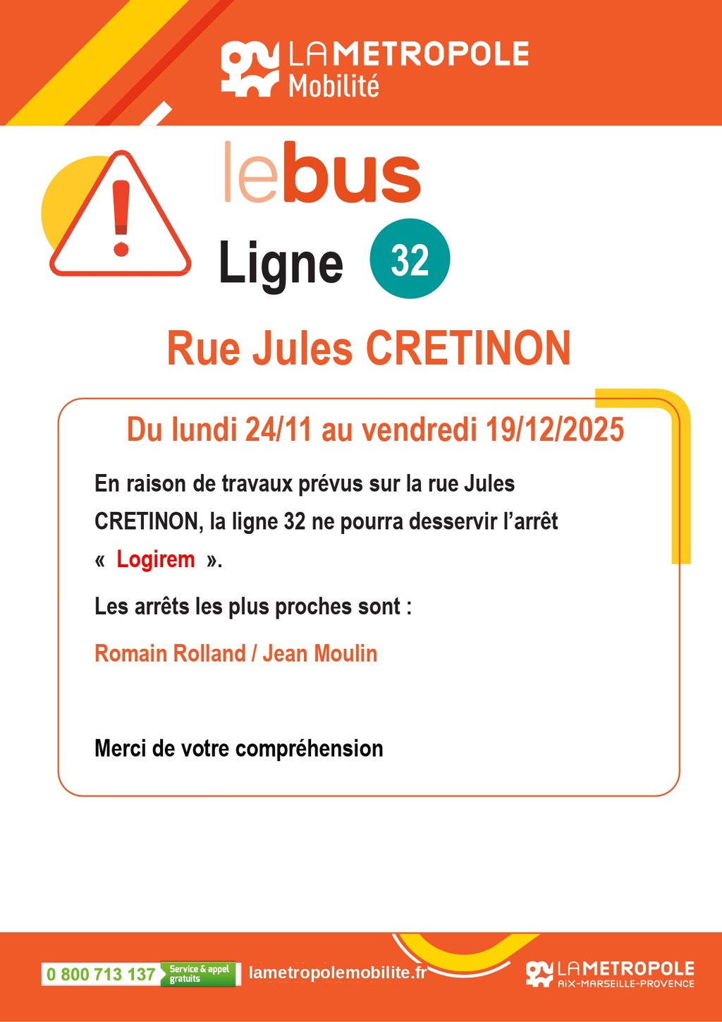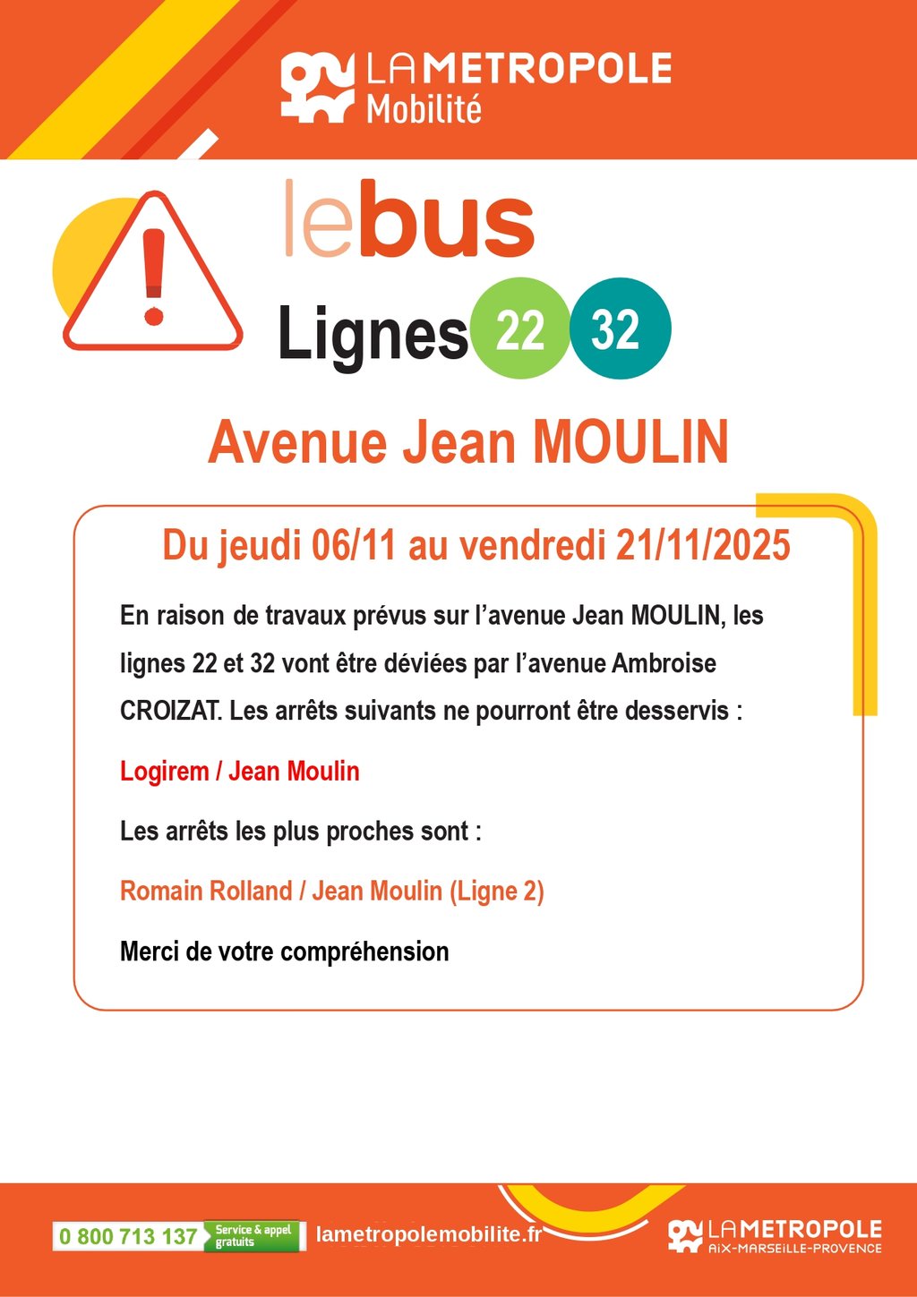 À compter du vendredi 24 octobre, avec le démarrage des travaux du réseau de thalassothermie Se@nergies dans les secteurs de la rue Jules CRETINON et de l'avenue Jean MOULIN, les arrêts des lignes 22,32 ainsi que les lignes scolaires seront déviées.