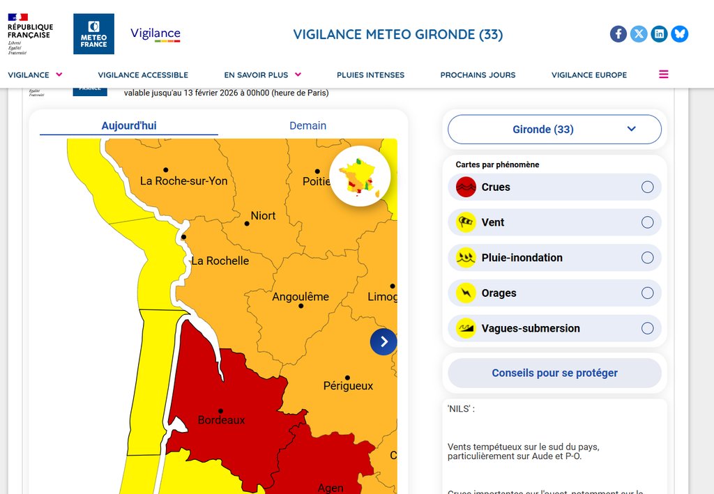 Météo France émet une vigilance crue pour la Gironde jusqu'au 13 février. Il faut également noter que de forts coefficients de marée sont prévus la semaine prochaine. Un sol saturé en eau et de forts coefficients peuvent engendrer la submersion de routes, notamment celles qui mènent au pont de Langoiran.