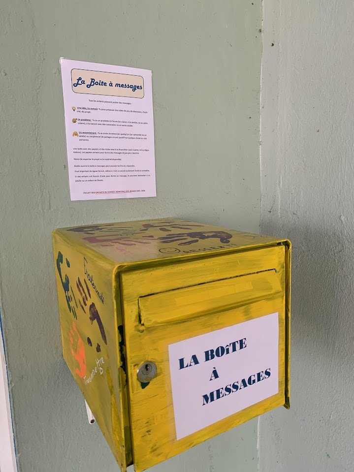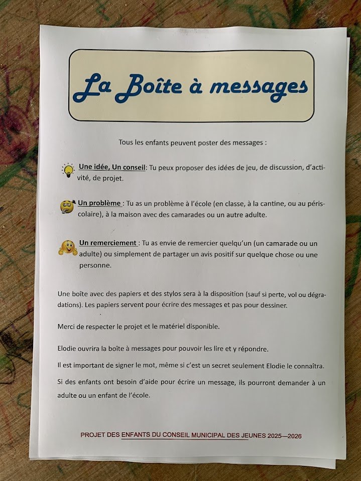 C'était un des projets du Conseil Municipal des Jeunes, la Boîte à Messages permet à tous les élèves de laisser une idée, un conseil, un problème, de témoigner d'un mal être ou au contraire de dire que tout va bien à l'école ou à la maison. Les jeunes élus ont relooké une vieille boîte aux lettres et l'ont installée avec de quoi écrire sous le préau de l'école. "Une seule personne (un adulte) dépouillera les messages laissés et sera donc au courant des secrets ainsi laissés" précise le CMJ qui a fait le tour des classes pour expliquer le fonctionnement de ce nouvel outil du "vivre ensemble"