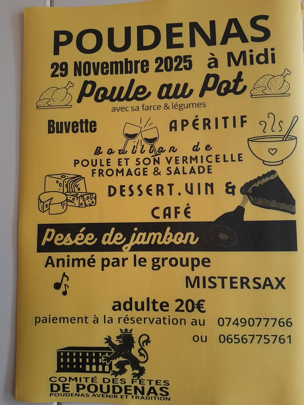 Le comité des fêtes POUDENAS AVENIR ET TRADITIONS organise son traditionnel repas de la poule au pot 🍯 le samedi 29 novembre à midi animé par le groupe MISTERSAX.