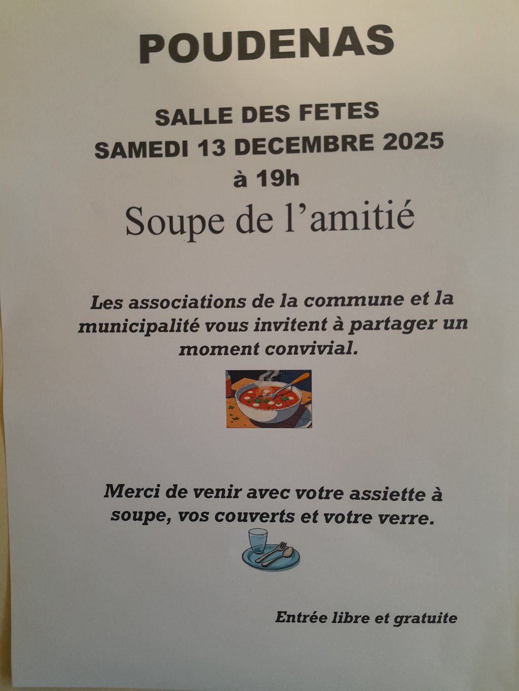 En cette fin d'année 2025, les associations et la municipalité vous invitent à partager un moment de convivialité autour d'une soupe de l'amitié le 13 décembre à 19 heures à la salle des fêtes du village.
